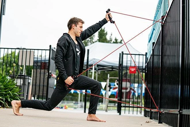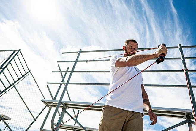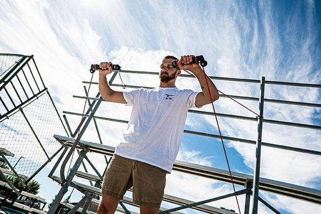 The Slide Dryland Trainer is designed to provide swimmers with exercises that mimic the entire swim stroke cycle with consistent resistance. Attach the cord to two different points on a chain-link fence (or similar) to add variety and different angles to your strength and conditioning training. The two rotating handles allow swimmers to practice hand and forearm positioning without cord interference or overloading.